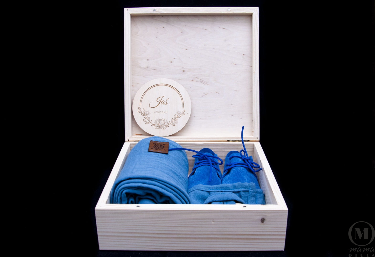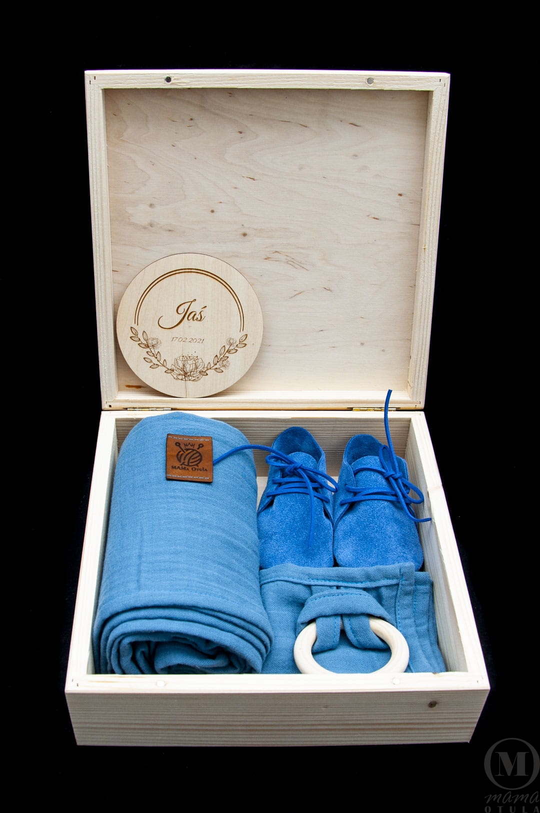 - Niebieska pieluszka z muślinu bawełnianego z drewnianym kółkiem lub innym drewnianym gryzakiem (dobór losowy) – na przygodę ząbkowania, jako zabawka sensoryczna i do przytulania;