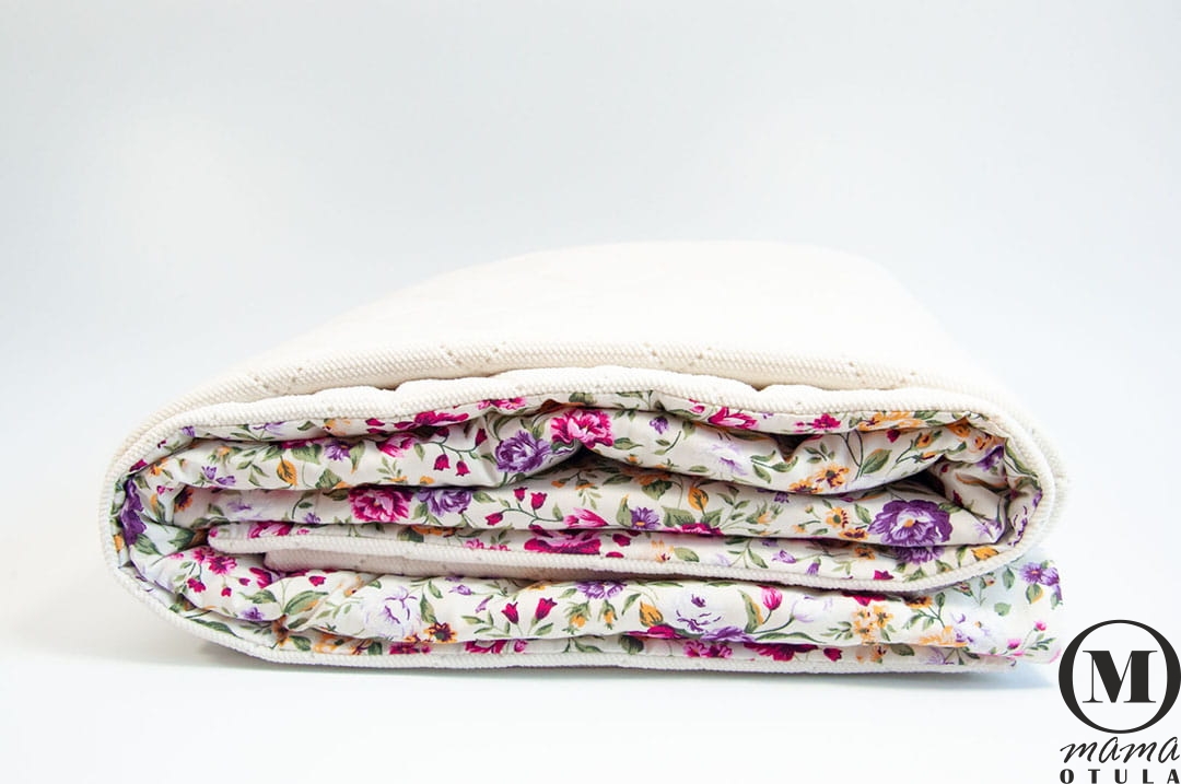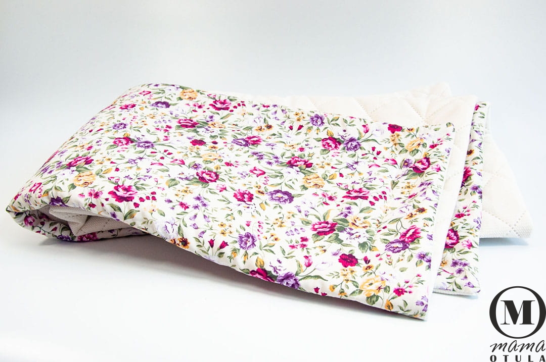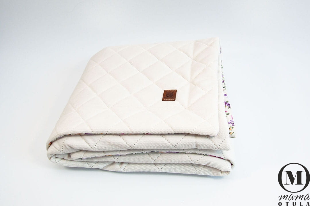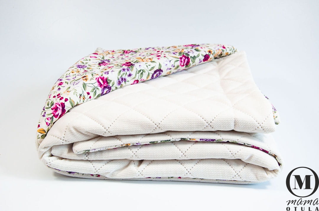 Dwustronna ręcznie wykonana narzuta z niezwykle miękkiego i przyjemnego w dotyku Velvetu pikowanego w kolorze śmietankowym a z drugiej strony z bawełny w przepiękny print kwiatowy, która sprawdzi się zarówno jako narzuta ale także jako okrycie dla twojego maluszka jak i przedszkolaka. Wypełniona jest puszystą włókniną, która jest na stałe wszyta do kocyka i nie przesuwa się podczas użytkowania oraz prania.