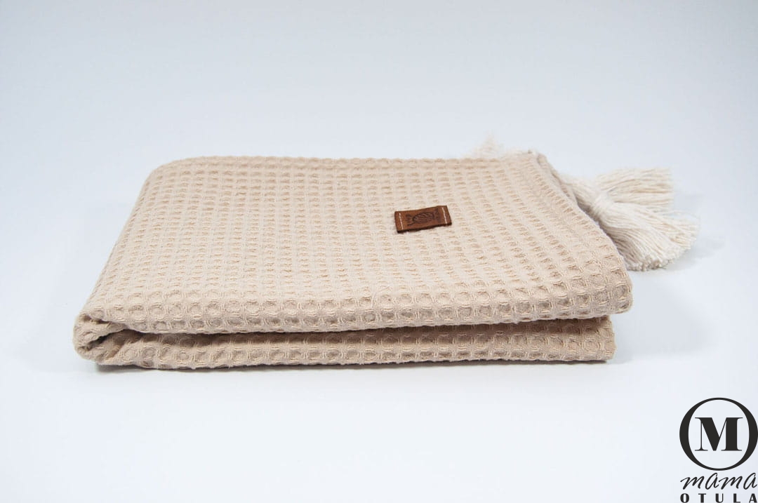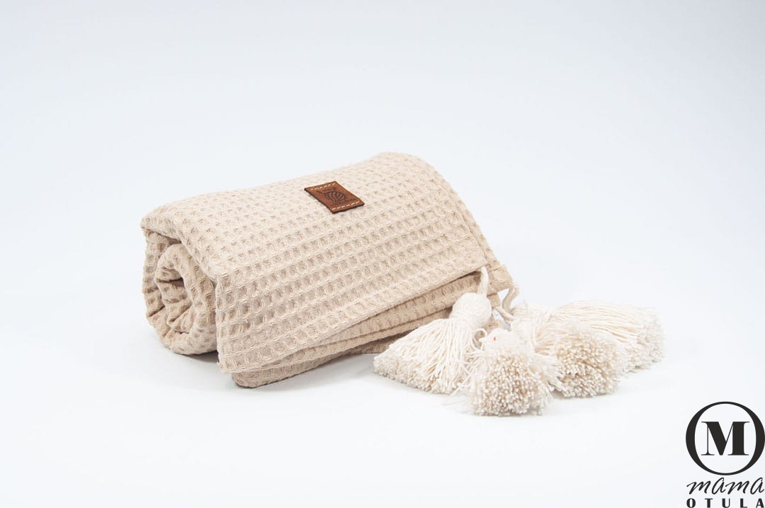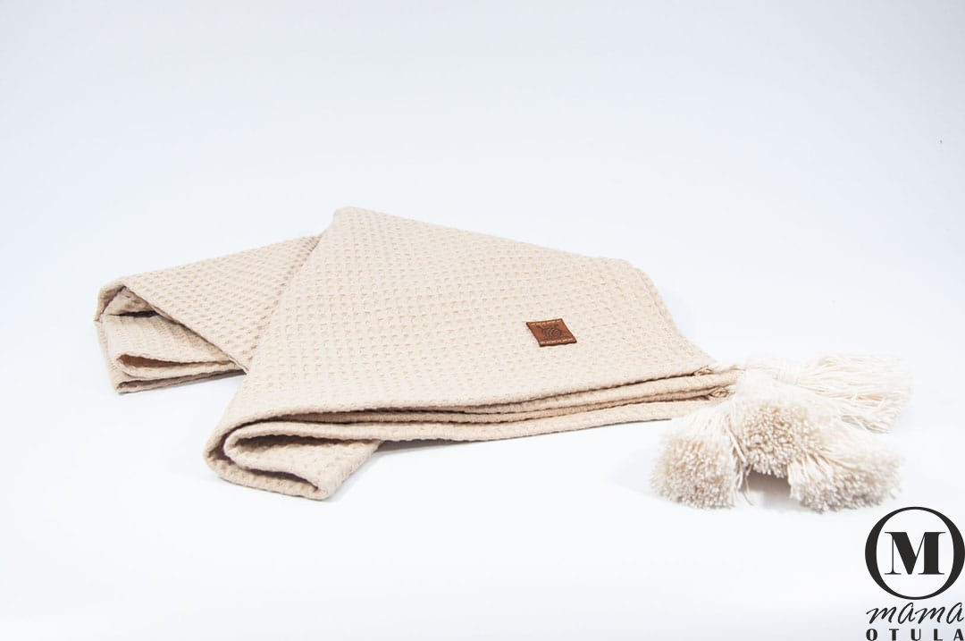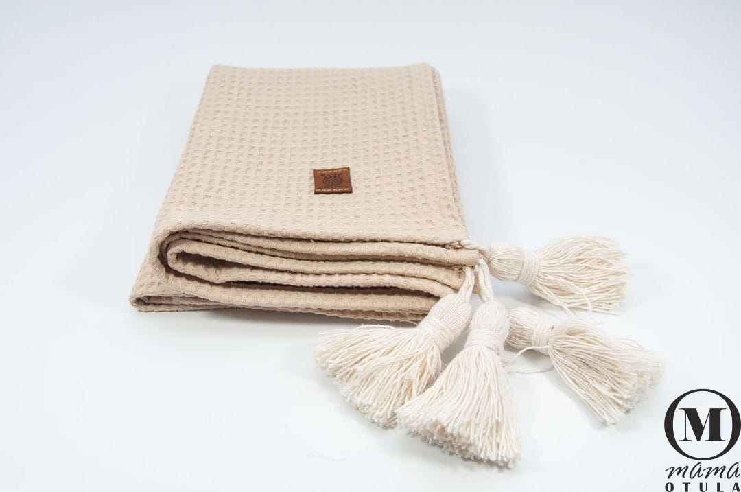 Kocyk dziecięcy sensoryczny, wafelek 70X100 cm kremowy, beżowy z chwostami BOHO