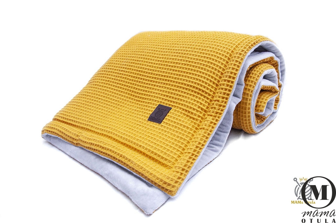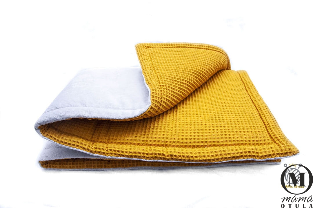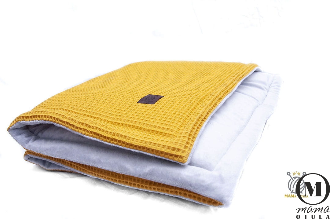 Bardzo ciepły dwustronny kocyk – MUSZTARDOWY wafelek bawełniany oraz mięciutkie SZARE gładkie futerko z wypełnieniem.