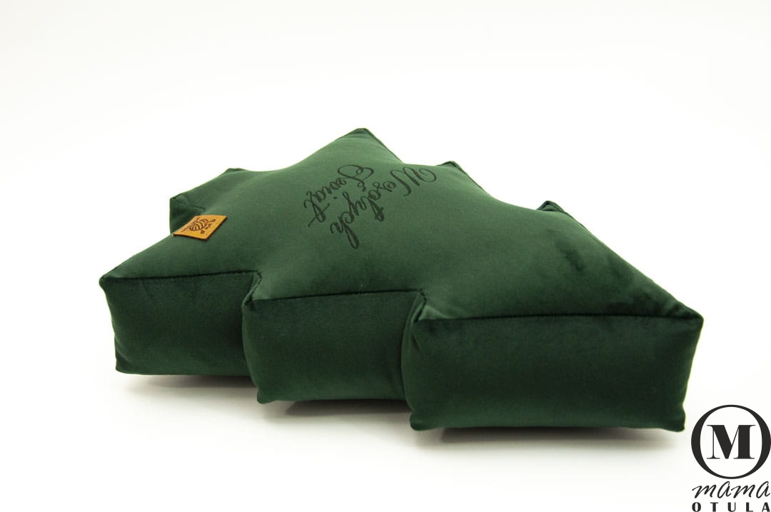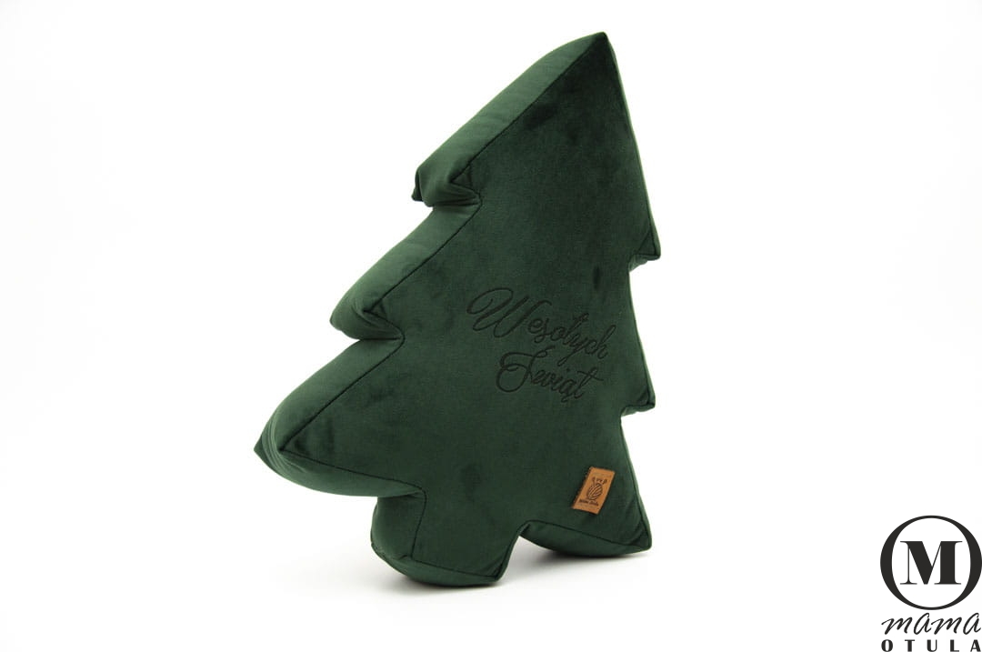 Piękna welurowa poduszka dekoracyjna w kształcie choinki z wygrawerowanym napisem - Wesołych Świąt.